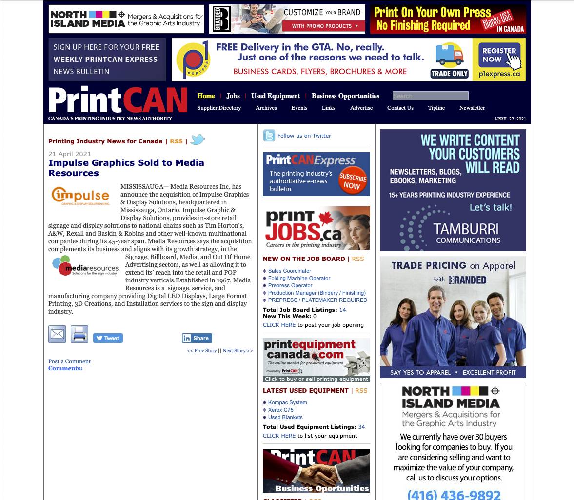 PrintCan berichtet auch über Media Resources, das Plakat- und Werbeschilder anbietet und im Rahmen seiner Wachstumsstrategie Impulse Graphics übernommen hat. Impulse Graphics bietet Lösungen für die Beschilderung im Einzelhandel und Displays für nationale Ketten wie die Café-Kette Tim Horton's.