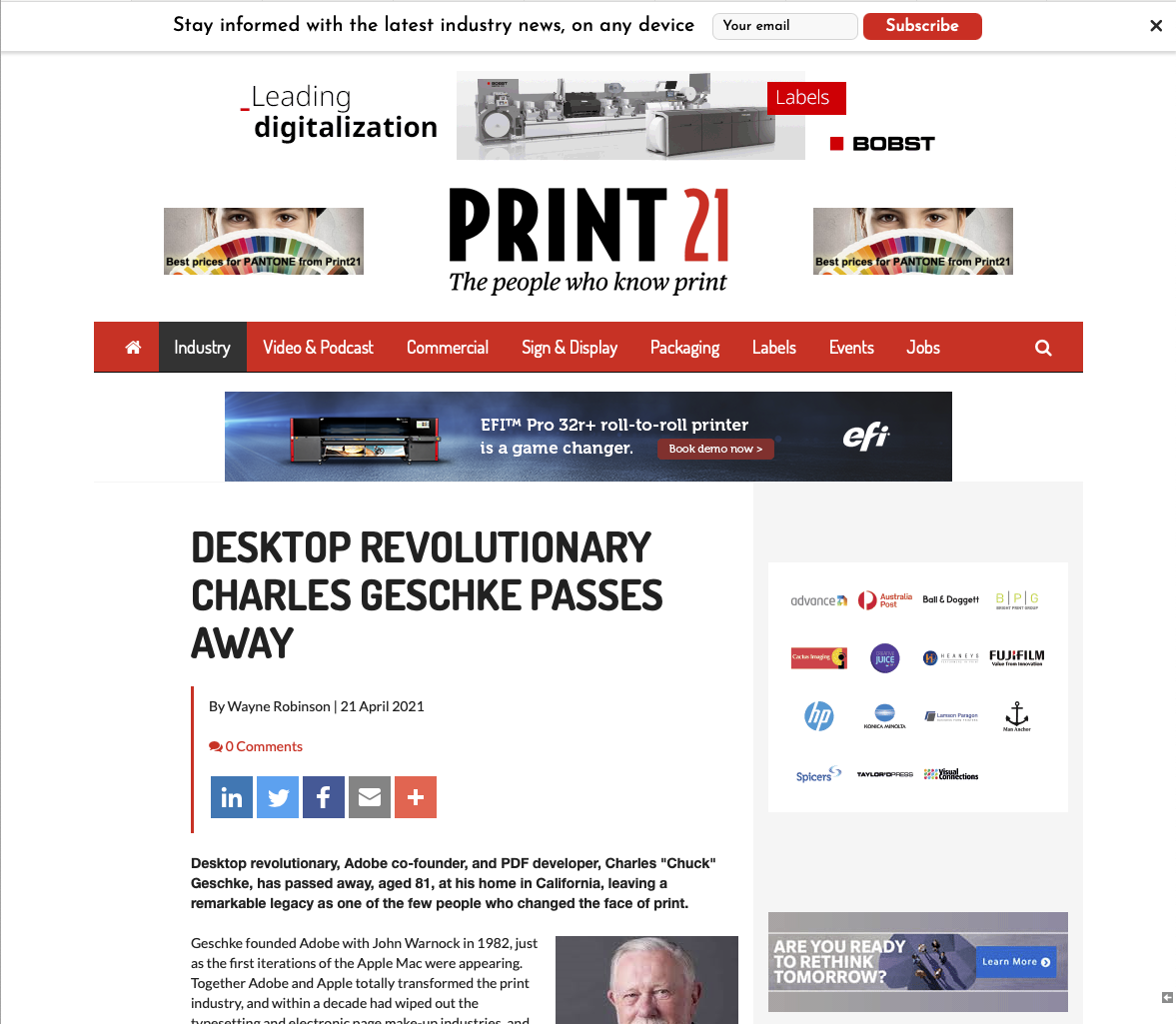 Aus Australien kommt Print 21, um die Leistungen von Charles Geshke zu feiern, der verstorben ist. Zusammen mit John Warnock war Geshke Mitbegründer von Adobe und entwickelte Postscript, den Grundbaustein, der zum Desktop-Publishing führte und die Druckindustrie nachhaltig beeinflusste.