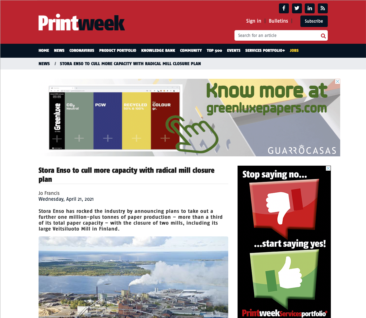 PrintWeek berichtet auch über die Pläne von Stora Enso, zwei ihrer defizitären Papierfabriken zu schließen, darunter die große Fabrik Veitsiluoto in Finnland, wodurch die gesamte Papierproduktionskapazität um mehr als ein Drittel reduziert werden würde.