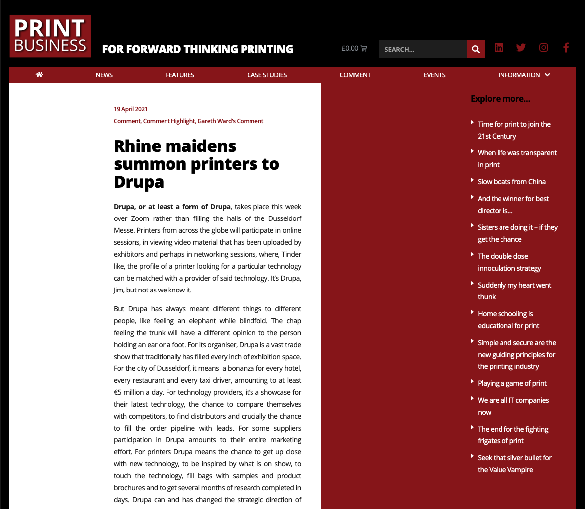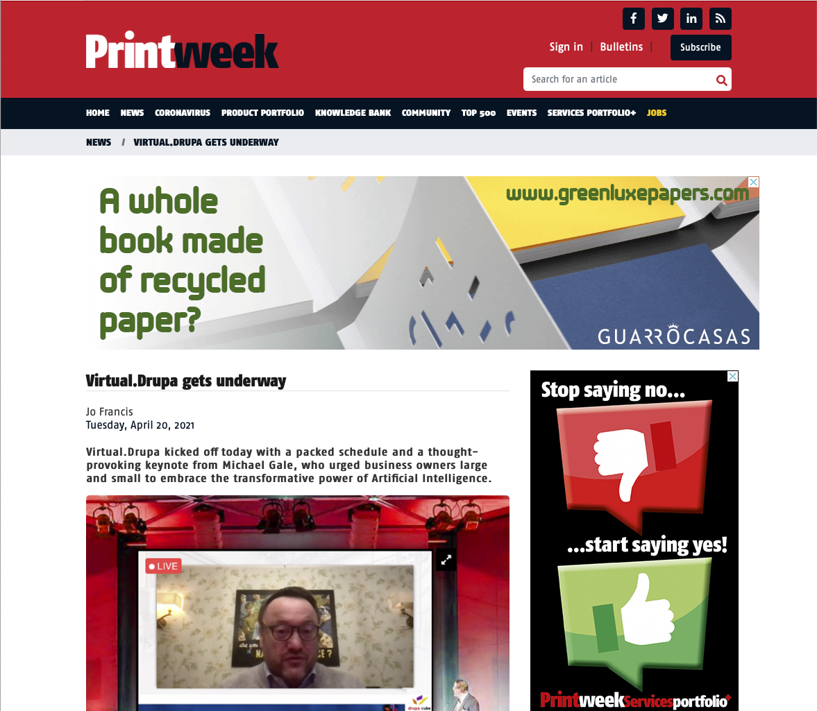 Es ist keine Überraschung, dass die meisten Zeitschriften Geschichten von dem virtual.drupa-Event diese Woche gebracht haben. Print Business beklagte den Mangel an Networking-Möglichkeiten bei einer Flasche Altbier, während PrintWeek über die Keynote-Präsentation der Veranstaltung von Michael Gale über die Vorteile von künstlicher Intelligenz berichtete.