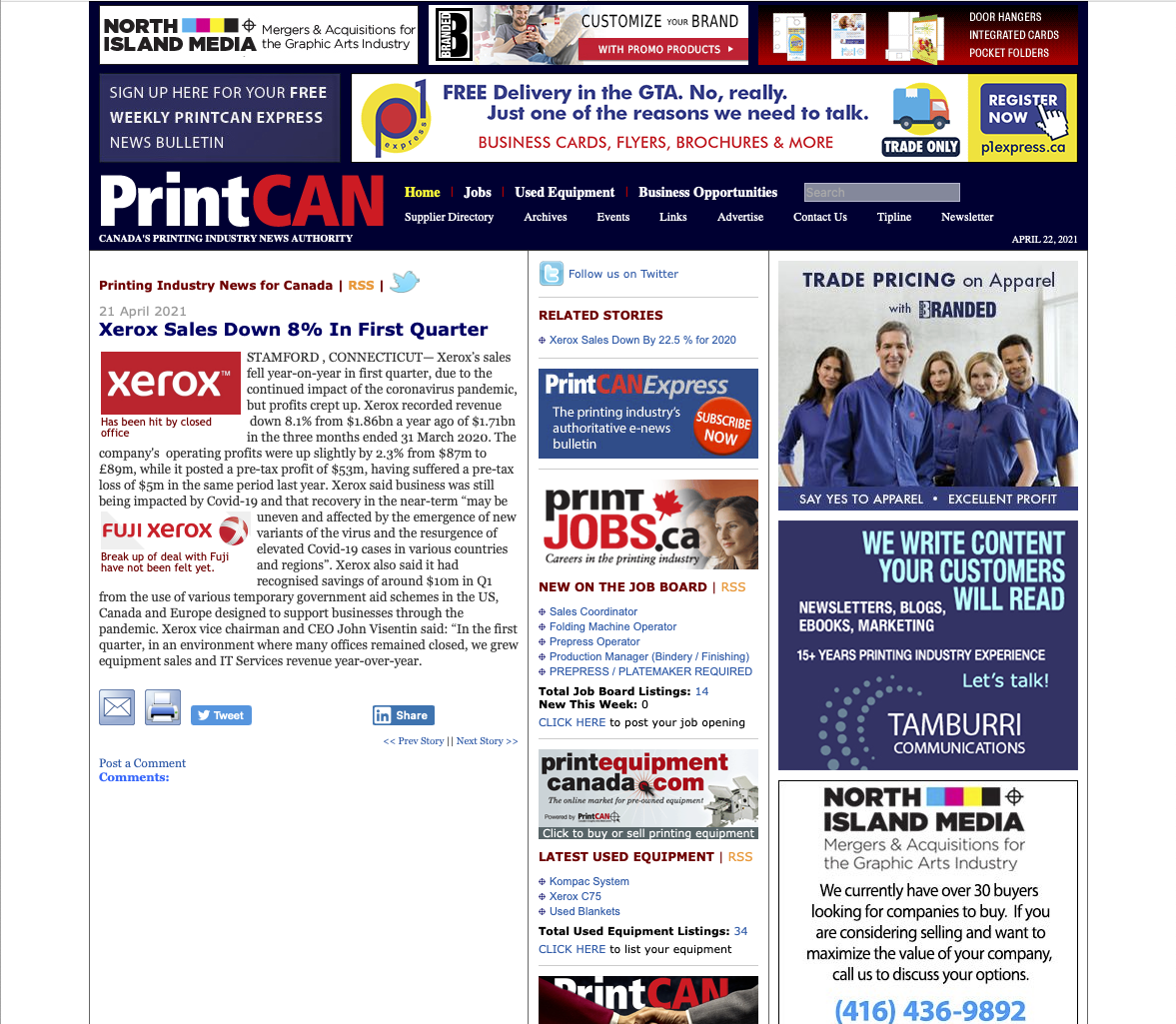 Aus Nordamerika berichtet PrintCan aus Kanada, dass der Umsatz von Xerox im ersten Quartal dieses Jahres um 8 Prozent gesunken ist, was Xerox auf die anhaltenden Auswirkungen der Coronavirus-Pandemie zurückführt