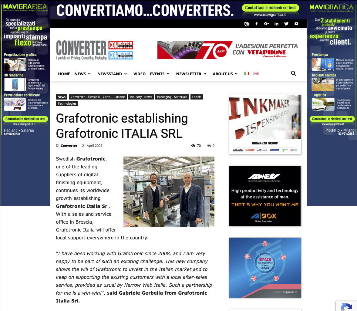 Das italienische Magazin Converter berichtet, dass das schwedische Unternehmen Grafotronic eine neue Niederlassung in Italien für den Vertrieb und Service seiner digitalen Finishing-Geräte gegründet hat.