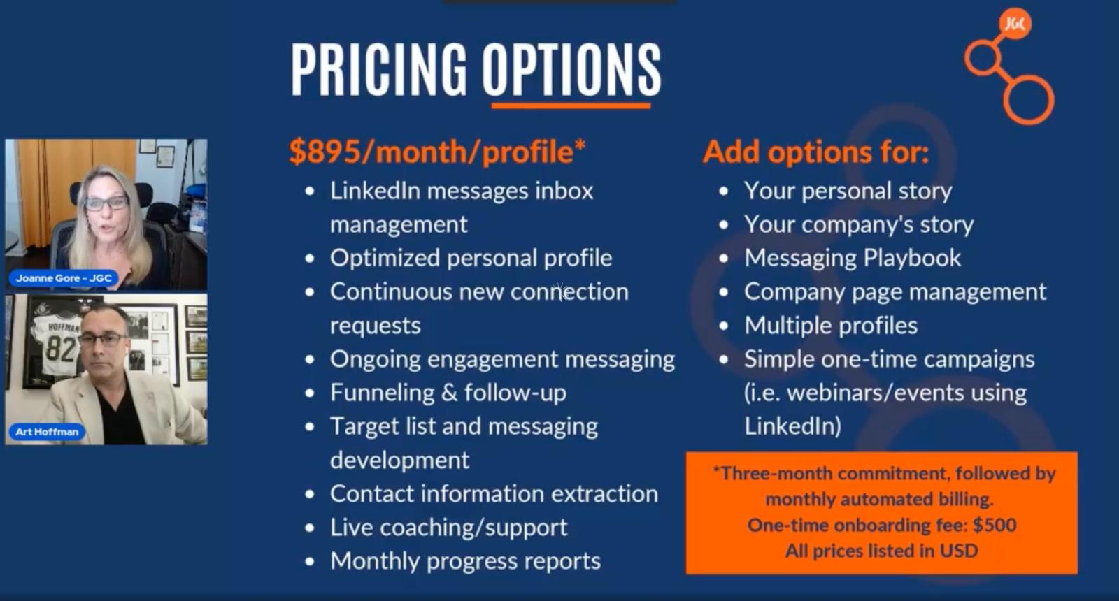 The "sales part" was presented by Art Hoffman, who runs In-Link Advisors company. The company offers, similar to Joanne Gore's product Business Connect. In this service, they essentially manage your LinkedIn profile (in your name) and target an audience to create a lead - and when scheduled, you take over the conversation yourself.