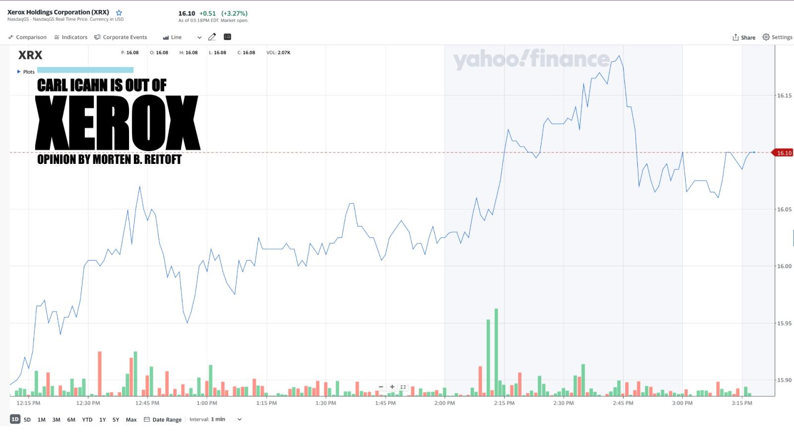 Congratulations. Today is an excellent day for Xerox, as the company finally gets rid of Carl Icahn, who, in my view, has destroyed Xerox and the opportunity the company had with Fujifilm to become one of the most prominent and most influential companies in the graphic arts industry. Now, Xerox bought back Icahn shares for $542 million, and a new Chairman of the Board has been appointed, Scott Letier.
