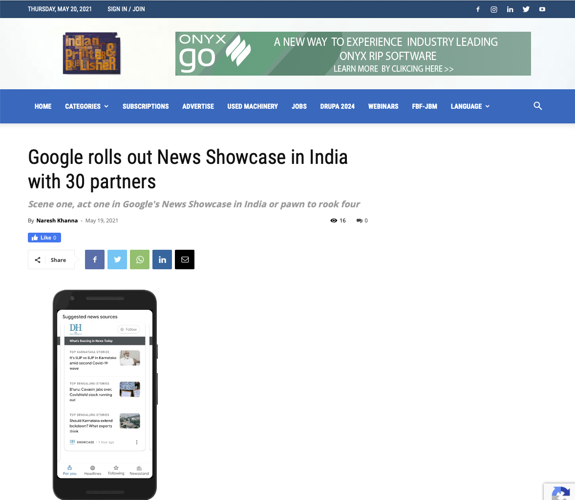Indian Printer and Publisher reports on Google’s plans to introduce its News Showcase in India, having signed up 30 news publishers and organisations in India to license content to Google. For now this is limited to English and Hindi but other Indian languages will be added later.