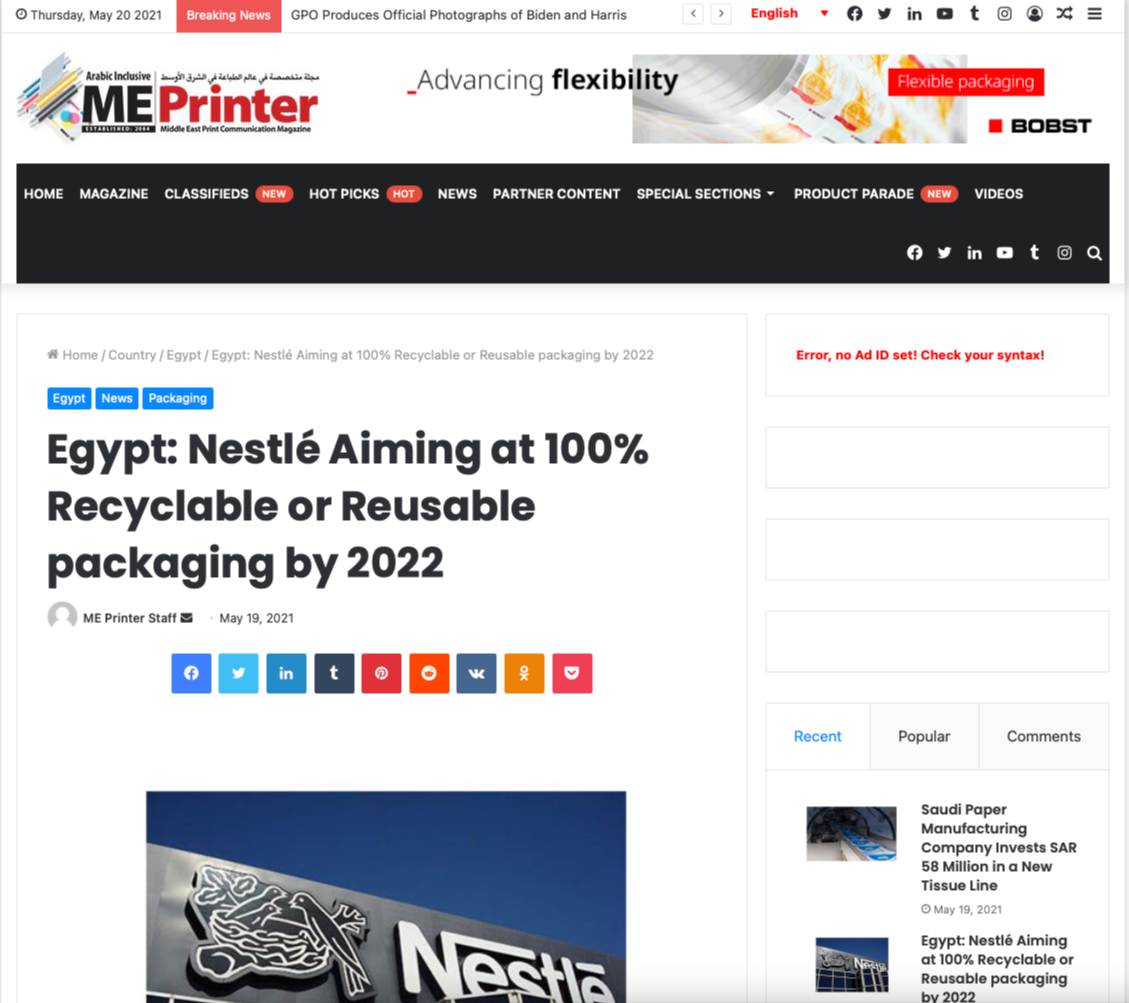 ME Printer also writes about Nestlé Egypt’s plans to use 100% recyclable packaging materials by 2022. Moataz El Hout, CEO of Nestlé Egypt, called on all companies operating in the local market to participate in the Plastic Packaging Material Recovery and Recycling initiative and to make more investments to preserve the environment.