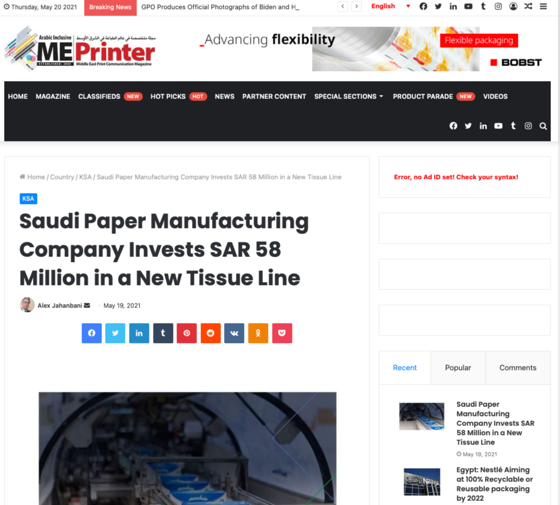 ME Printer has a story on the Saudi Paper Manufacturing Company, which has just spent SAR 58 million (€12.65m) to buy a tissue paper rolls production line from the Italian manufacturer Toscotec in a bid to increase its production from 100,000 tons to 130,000 tons per year.