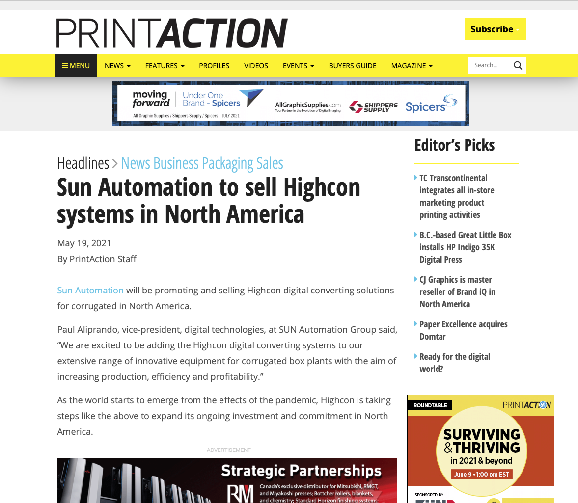 From Canada, Print Action reports that Sun Automation, which provides solutions for corrugated producers, is to start selling Highcon’s digital converting devices in the North American market. Highcon is expanding in the region, having doubled its headcount in the first four months of this year.