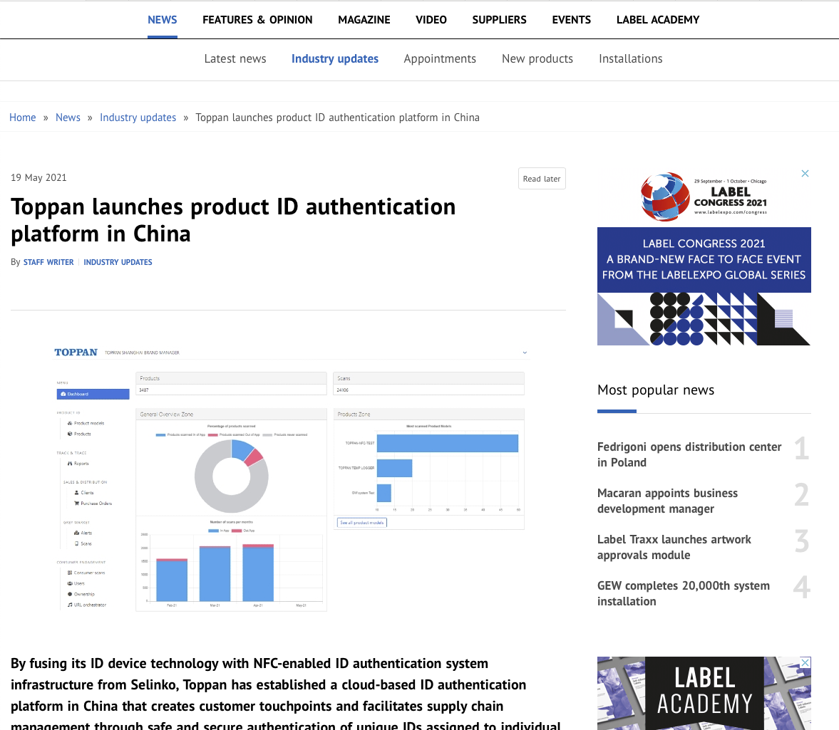 Labels and Labelling writes that the international Japanese printing company Toppan has established a cloud-based ID authentication platform in China to offer customers better engagement and to improve the supply chain management. L&L says that Toppan’s ID authentication functions can be added to a client’s own service platforms and information shared with ERP and CRM systems.