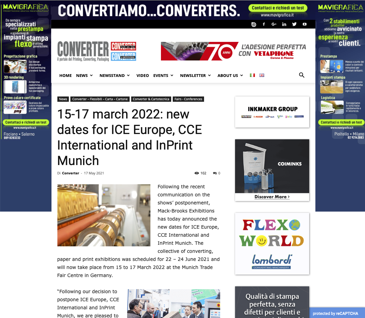In Europe, Converter magazine notes that new dates have now been announced for the joint ICE Europe, CCE International and InPrint Munich trade shows, which were postponed from June this year to March 2022, which seems much more realistic given the current state of the pandemic.