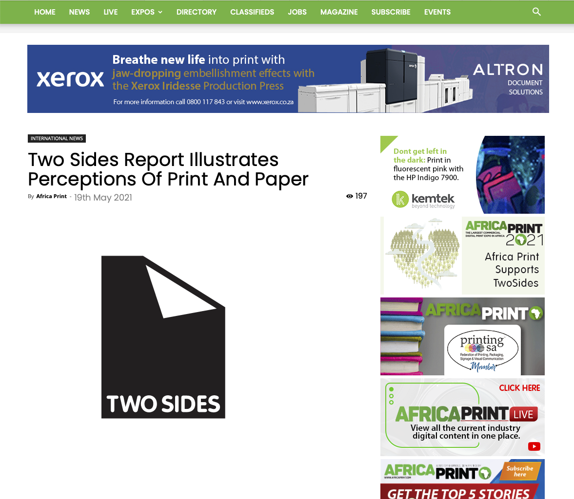 Finally, Africa Print covers a sober study by Two Sides that suggests that many consumers are unaware that European forests are growing or just how much paper is now recycled. Instead, many consumers believe that electronic communication is more environmentally-friendly than paper, not helped by the reliance on online meetings and media over the last year or so.