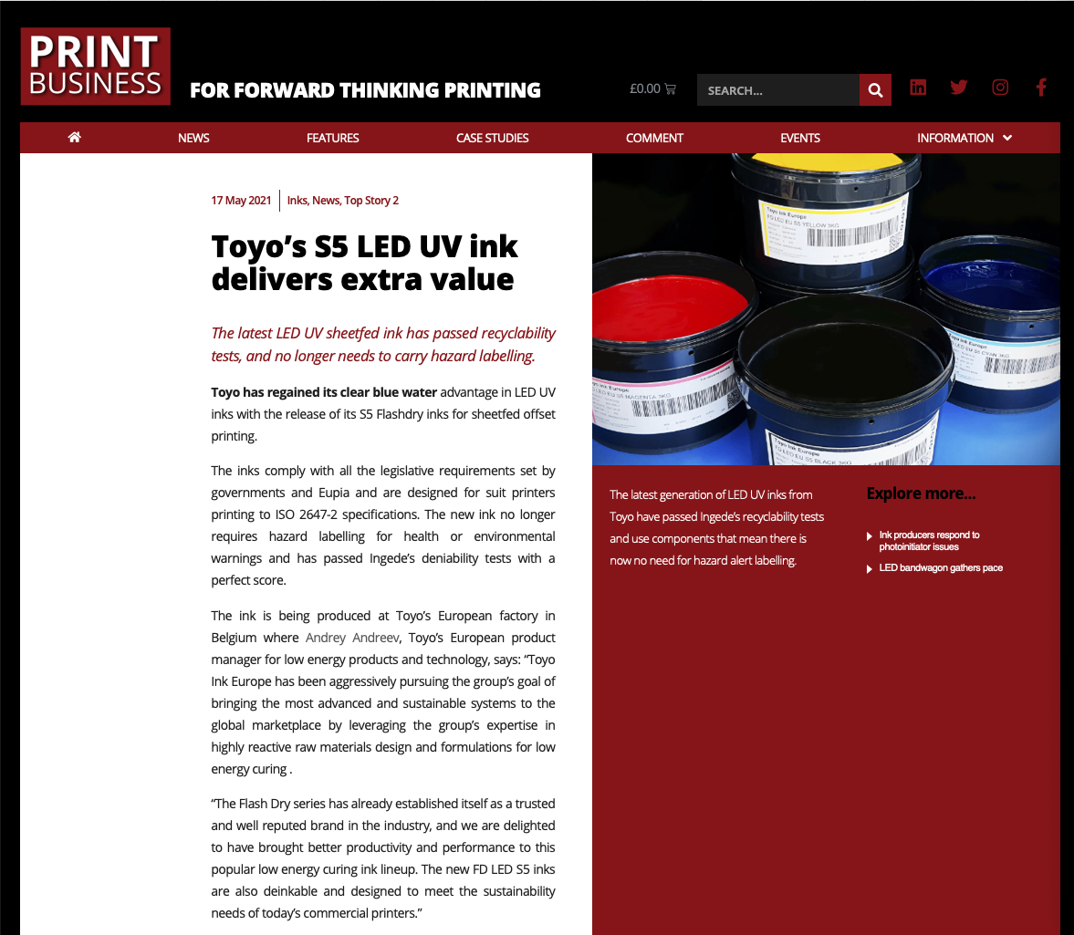 Print Business carries a story on Toyo’s new S5 Flashdry LED UV inks for sheetfed offset printing. There’s no need for any hazard or environmental labelling and the ink passes Ingede’s deinking tests. Demand for this ink, which is produced at Toyo’s European factory in Belgium, has been driven by the packaging sector.