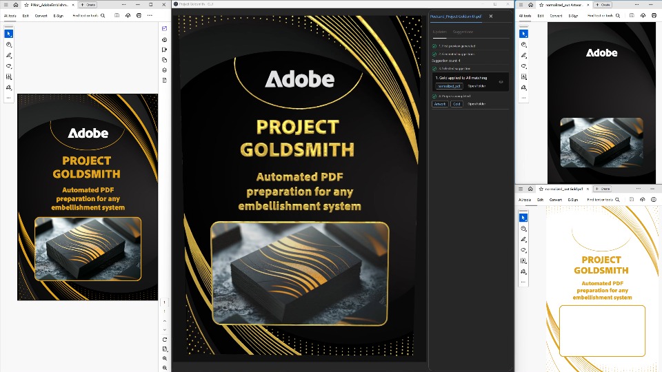 Traditionally, adding embellishments to printed materials requires extensive coordination between designers and print service providers, often involving manual file adjustments and variable workflows across different equipment. Project Goldsmith by Adobe removes these challenges by automating the process of job preparation and generating production-ready files with precise embellishment data. The technology reduces human error, accelerates production times, and increases profitability for print service providers by transforming hours of manual setup into minutes of automated processing.