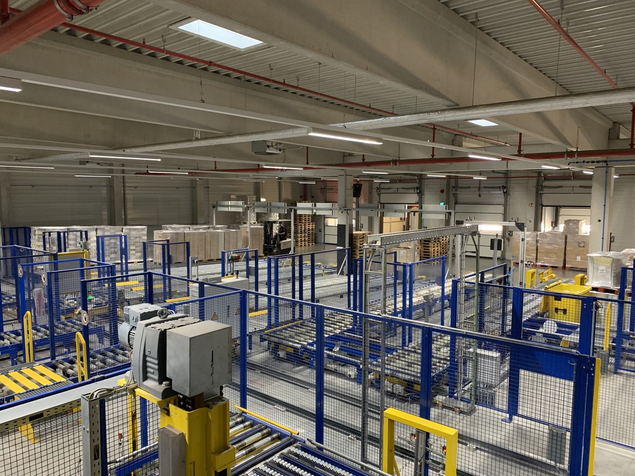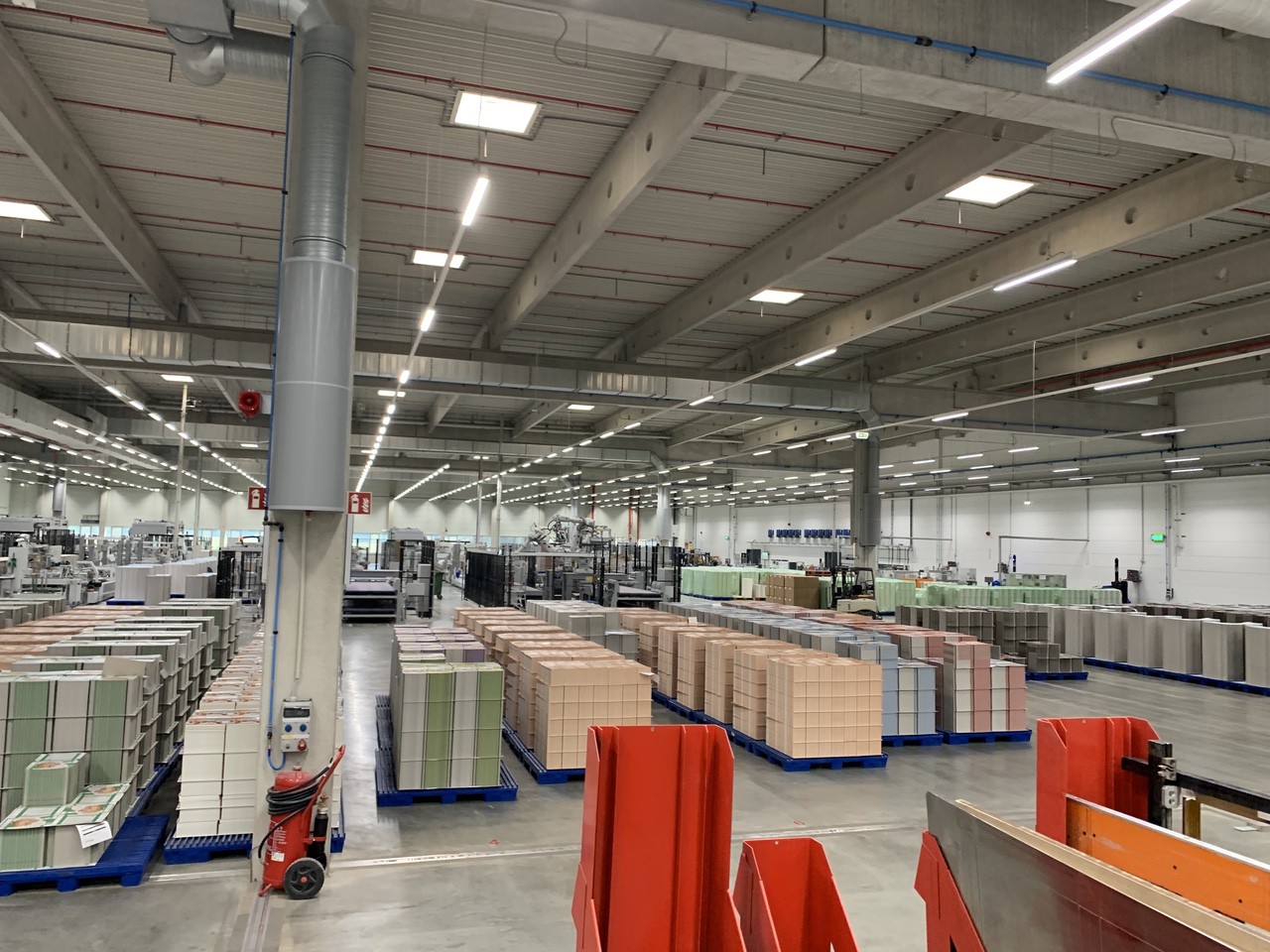 When we entered the high-bay warehouse, it's fully automated, and you see robots handling both raw materials and finished products, ready to be shipped. The warehouse contains 23,000 pallets and interfaces with the Schur Logistics solution. The automated warehouse delivers raw material to the printing machines and finished products to the trucks picking up the goods for delivery. The essence of the logistics solution is to remove manual processes like moving pallets from the warehouse to the printing machines, from the printing machines to the die-cutters, to the gluing lines, to the packaging lines, and back to the high-bay. All over, you see AGV (Automated Guided Vehicles) bring pallets around at the shop floor.