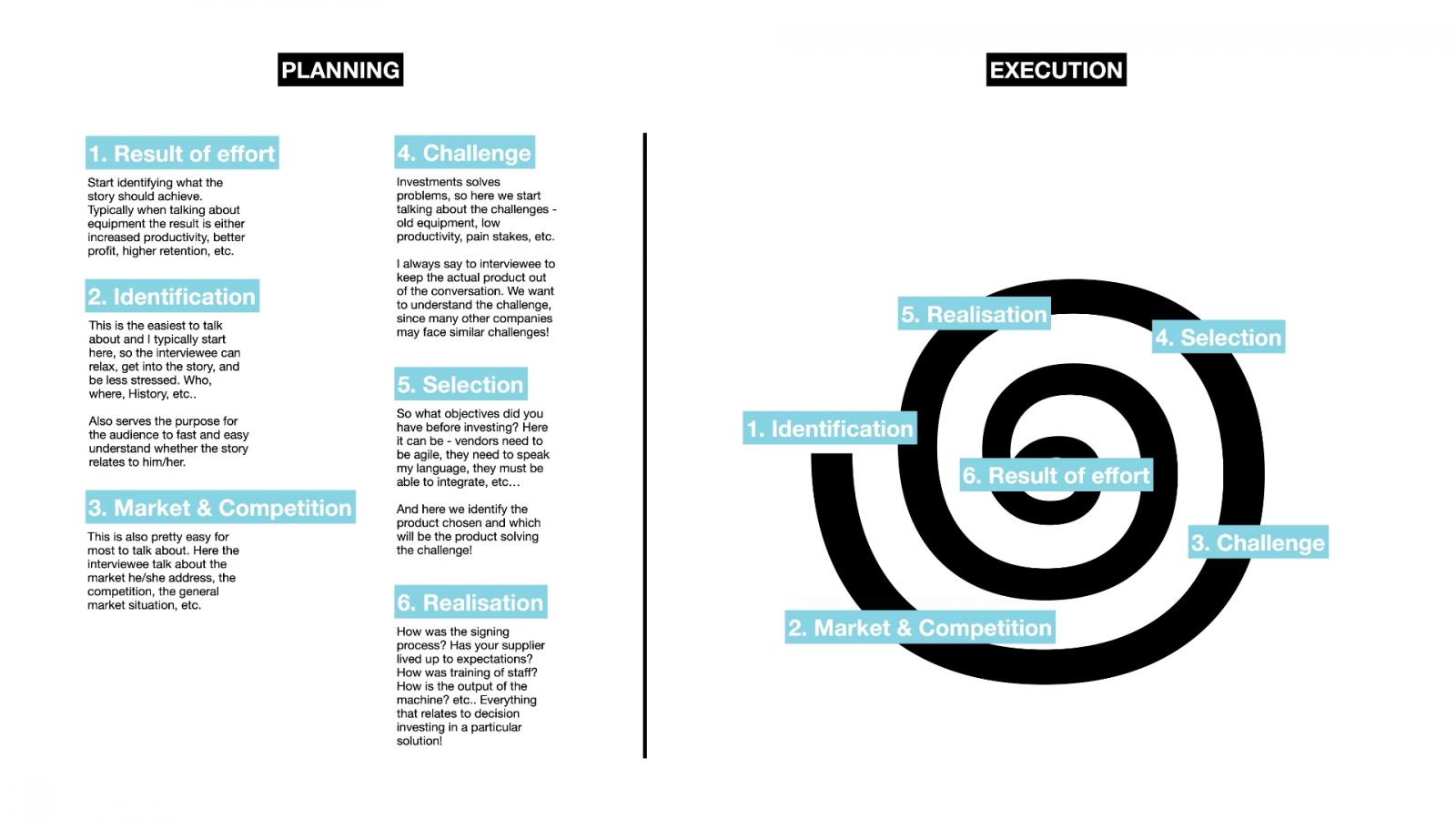 Rather than preparing questions, we prepare the process. What do we want to achieve? Where should the story end, and then you start building the pieces around the result supporting the customer journey!