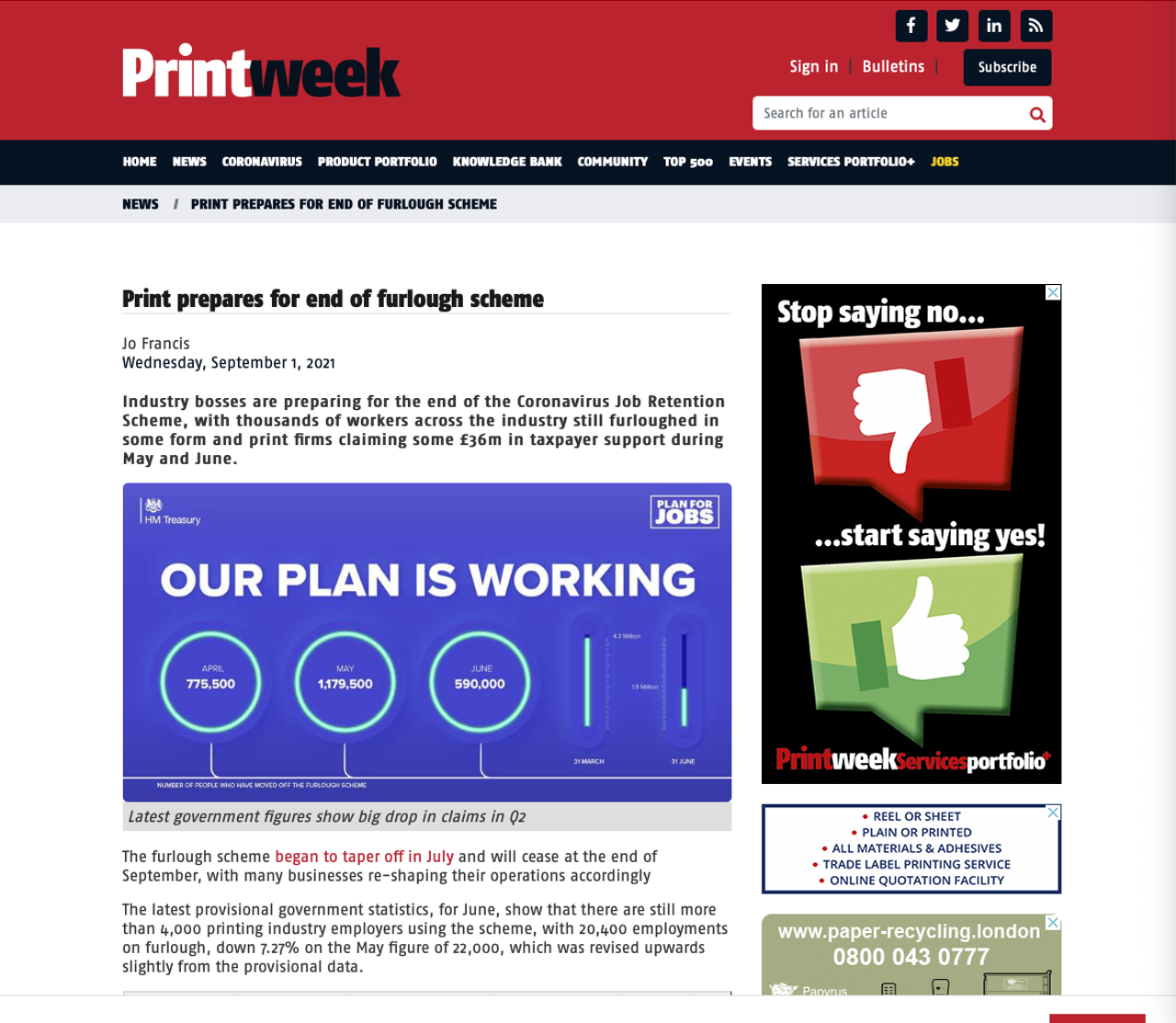 According to Printweek, British printers are preparing for the end of the government’s Coronavirus Job Retention scheme though a recent Printweek poll found that almost 58% of respondents were still claiming furlough help. However, the story points out that many printers have restructured and are not expecting further redundancies to result.