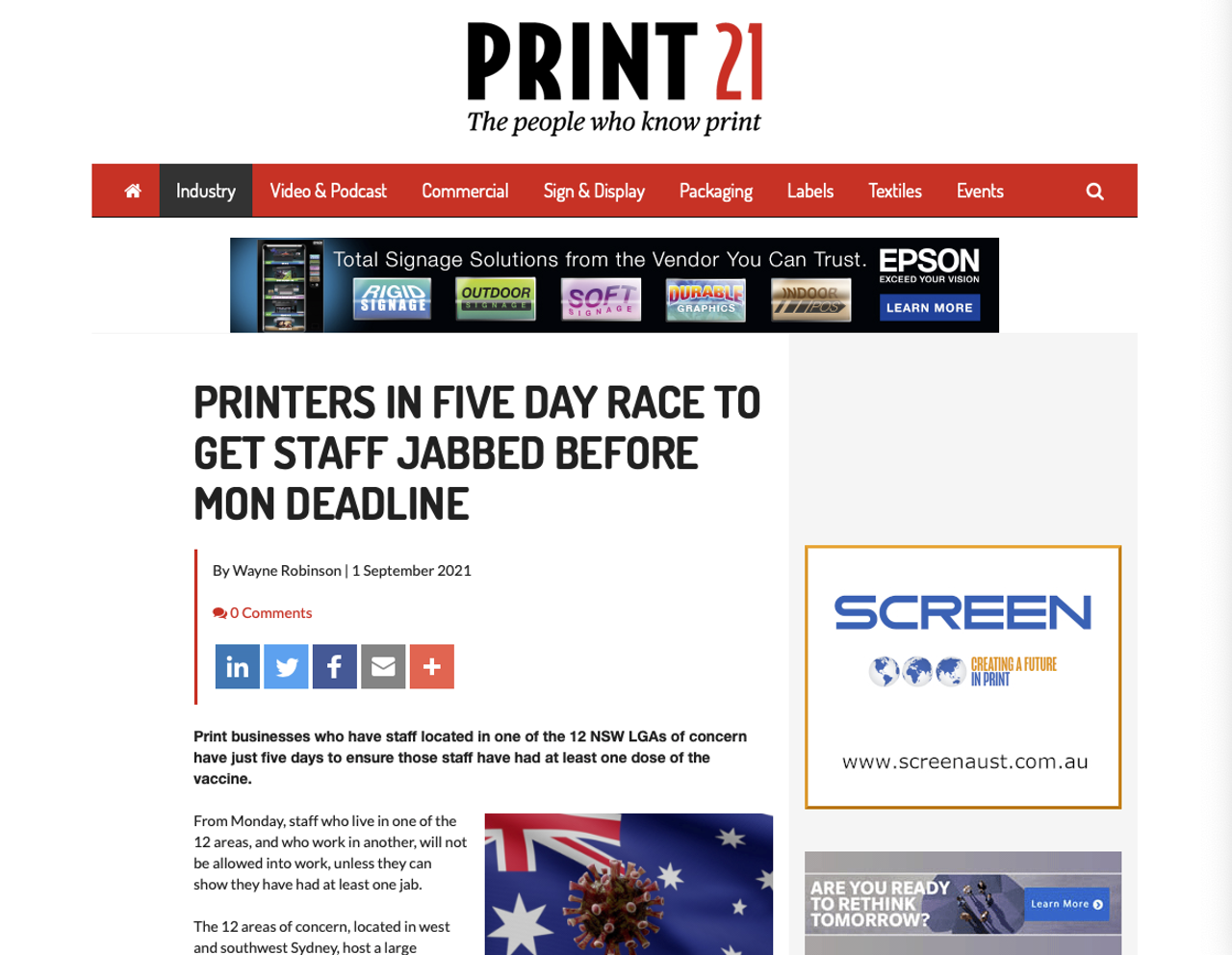 From Australia, Print21 states that printers based in 12 areas of New South Wales have just five days to ensure their staff have at least one dose of a covid vaccine under new government rules. Fortunately there’s no issue with vaccine supplies and printers in these areas are working to protect their staff.
