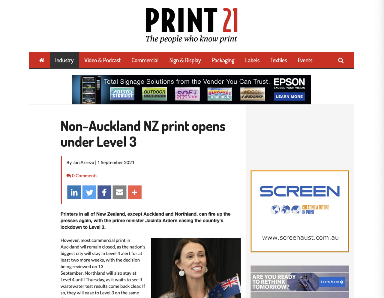 Meanwhile, Print21 reports that New Zealand printers outside of Auckland can reopen as the lockdown eases to level 3, with a further review of the covid situation promised in a week’s time. The story quotes Ruth Cobb of PrintNZ, pointing out that the organisation’s safety protocols should help printers keep working.