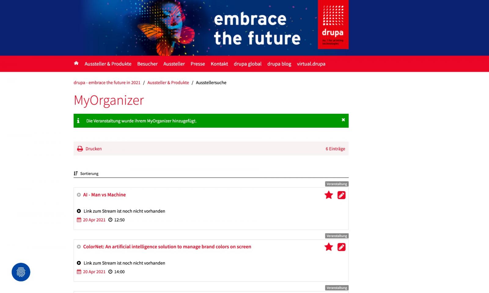 In the conference area, you find an overwhelming number of events, and you can filter your selection on various topics, like language, topics, etc. This is all good, but when you have found an event you want to attend, you have to click 'iCal' or 'MyOrganizer,' which is absolutely not intuitive. If you are not German-speaking, it becomes even more confusing as a new page is opened in GERMAN with your confirmations in German. You CAN change to English, of course, but the drupa website has now opened 4-5 tabs and asked numerous times to confirm cookies. It turns me of hundred percent and seems that the "platform" hasn't been tested for user experience!