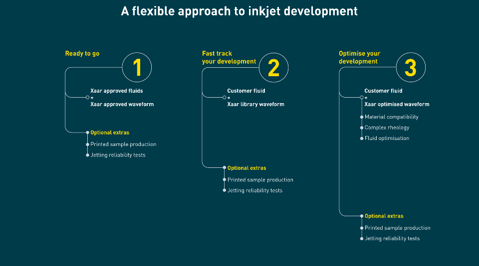Xaar has introduced a powerful new fluid development and optimisation process aimed at helping manufacturers and OEMs fast-track inkjet system development, reduce costs, and accelerate time to market. Built on Xaar’s renowned expertise in inkjet printhead technology, the flexible, scalable process supports three streamlined pathways to bring disruptive applications to life—ranging from off-the-shelf fluids to fully bespoke waveform development.
