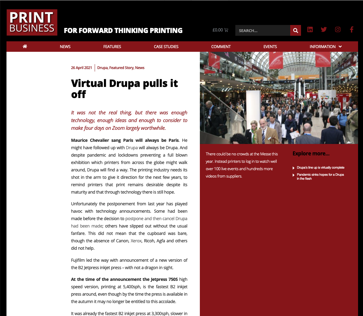 Print Business est l'un des nombreux magazines à publier un article intitulé « Virtual Drupa pulls it off » (pari réussi pour la virtual drupa) avec un rapide aperçu de certaines des annonces de produits.