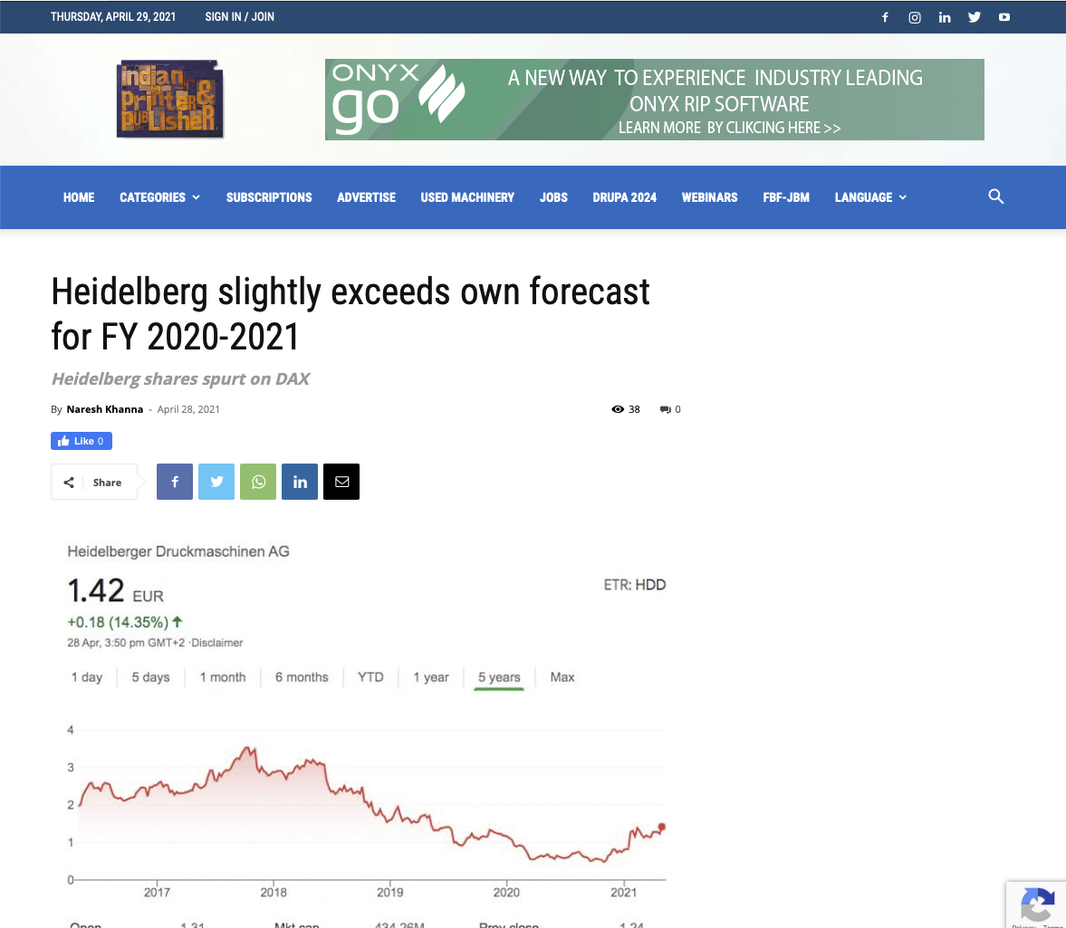 Indian Printer and Publisher rapporte les chiffres préliminaires de Heidelberg pour l'année se terminant le 31 mars 2021, qui montrent une augmentation de la demande en