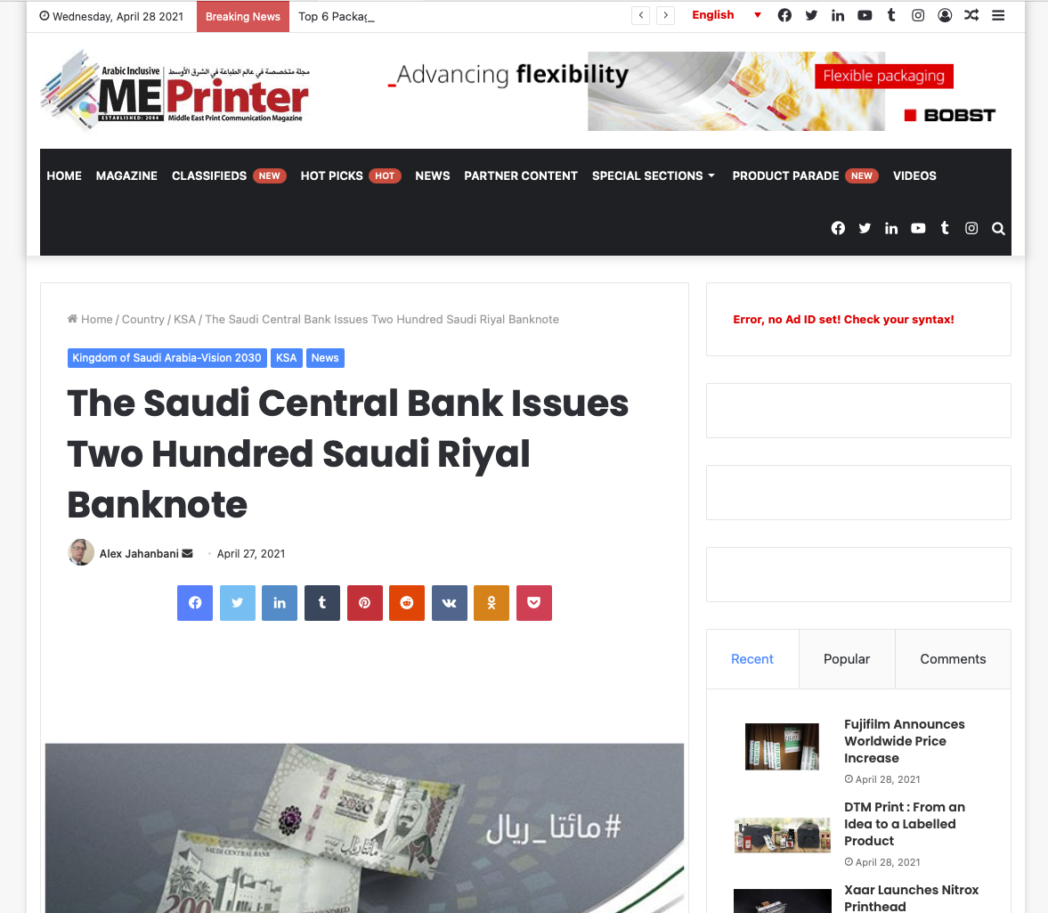 ME Printer rapporte que la banque centrale saoudienne a émis un billet de deux cents riyals saoudiens pour marquer le cinquième anniversaire du programme « Kingdom’s Vision 2030 », la nouvelle coupure se « caractérise par diverses spécifications techniques, des composantes de sécurité de haute qualité, un design distinctif et des couleurs attrayantes ».