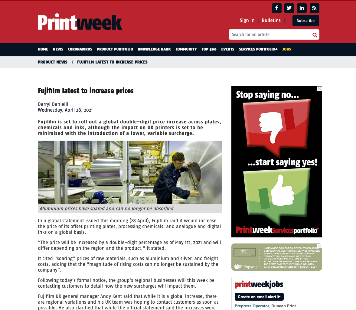 Printweek publie également un article sur les projets de Fujifilm de « déployer une augmentation des prix à deux chiffres à l'échelle mondiale pour les plaques, les produits chimiques et les encres » en raison de la hausse des coûts des matières premières et du transport de marchandises.