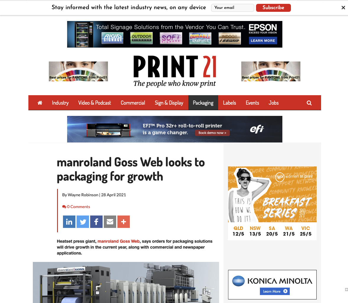 Toujours en Australie, Print21 publie un article sur Manroland Goss Web, qui est convaincu que les commandes de solutions d'emballage seront le moteur de la croissance de l'année en cours, tout comme les applications commerciales et celles des journaux ; un avis que de nombreux vendeurs de presse partagent probablement.