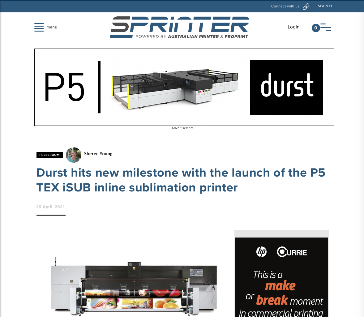 Sprinter le hub en ligne de Australian Printer et ProPrint, a été l'un des premiers médias à publier un article sur la nouvelle imprimante à sublimation P5 Tex iSub de Durst, équipée d'une unité de finition en ligne pour la couture et l'assemblage et destinée à la signalisation en matériaux souples ainsi qu'à la décoration intérieure et aux vêtements.