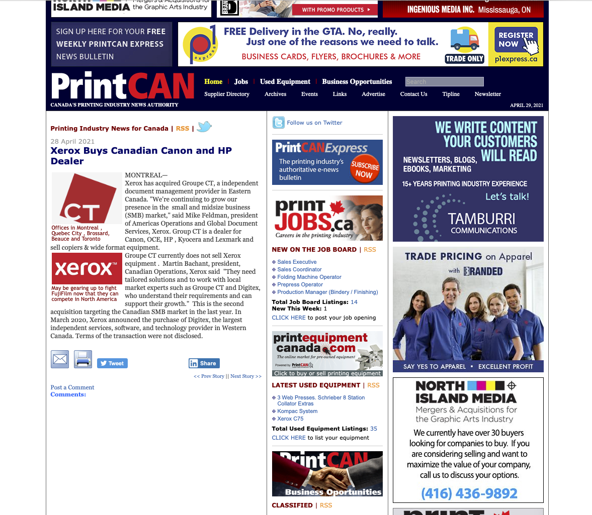 Au Canada, PrintCan note que Xerox a acquis le Groupe CT, un fournisseur indépendant de gestion de documents dans l'est du Canada, qui vend actuellement des kits de Canon et HP, mais pas Xerox.