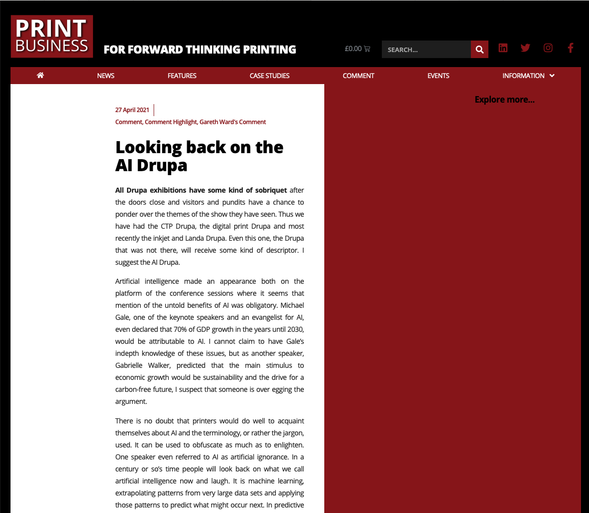 Dans un autre article, Print Business souligne l'accent mis sur la technologie de l'IA, mais également le fait que l'événement a attiré moins de 10 % du public d'un événement en direct, l'appelant ainsi « The Almost Invisible Drupa » (la drupa presque invisible), ce qui résume bien ce que de nombreux journalistes pensent en privé de ces événements en ligne.