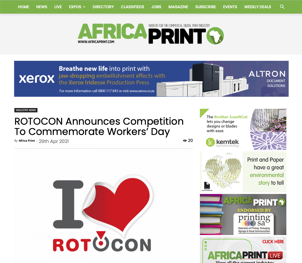 Selon Print Africa, la société sud-africaine Rotocon a lancé un nouveau concours, I love Rotocon, pour que les employés de leurs clients partagent des photos d'eux avec des équipements Rotocon et ceux de ses 14 partenaires, dont Domino, MPS et Screen.