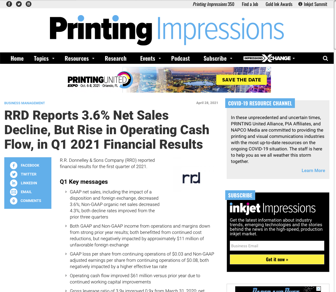 Aux États-Unis, Printing Impressions publie un article sur les résultats du premier trimestre de cette année de RR Donnelley, qui montrent une baisse des ventes nettes mais une amélioration du flux de trésorerie opérationnel.