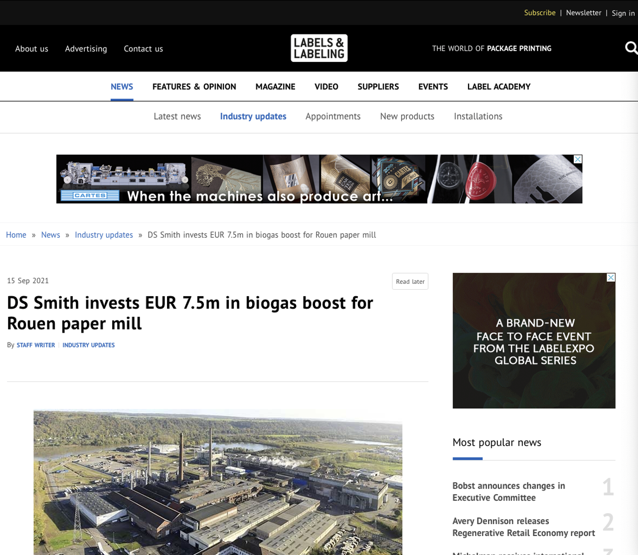 Ten slotte, Etiketten en etikettering merkt op dat het verpakkingsbedrijf DS Smith € 7,5 miljoen heeft geïnvesteerd om de anaerobe behandelingsinstallatie in de papierfabriek van Rouen in het noorden van Frankrijk uit te breiden. Dit proces, dat micro-organismen gebruikt om biogas te creëren, betekent dat de site al zijn afvalwater kan gebruiken om groene energie te genereren.
