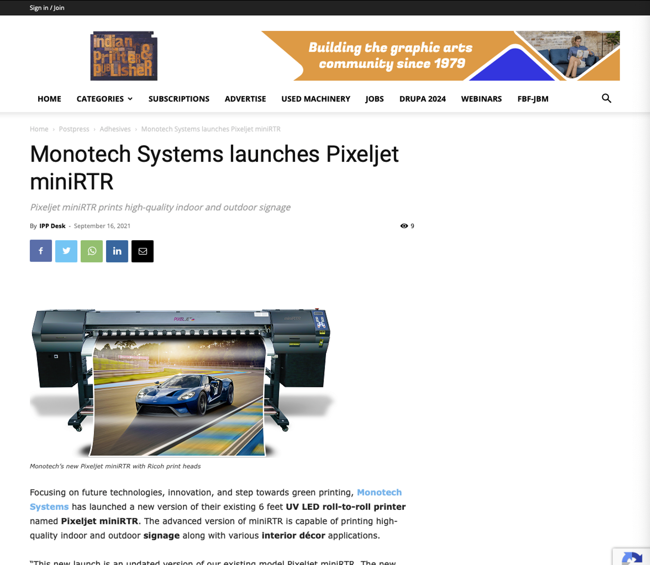 Indian Printer en Publisher rapporten dat Monotech Systems, gevestigd in Chennai, heeft bijgewerkt zijn UV-LED Pixeljet MiniRTR, een 1.8m breed formaat rol te rollen printer, die nu gebruikt Ricoh industriële kwaliteit printheads. Het is gericht op de bewegwijzende en interieur decor markten en drukt CMYK met opties voor witte en duidelijke inkt.