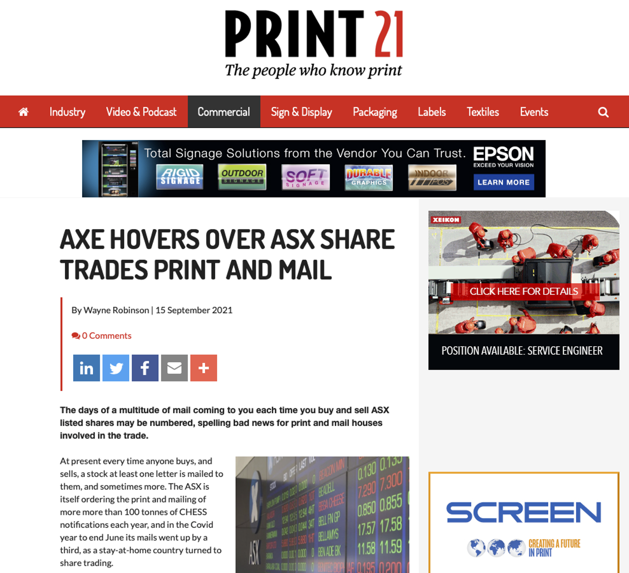 Print21 rapporten dat de ASX Australian Securities Exchange is van plan om meer digitale communicatie dit jaar, die waarschijnlijk zal leiden tot minder gedrukte mailings en zal slecht nieuws voor print en mail huizen die betrokken zijn bij de handel. Dit omvat 100 ton verklaringen, verdienen ASX $24m per jaar.