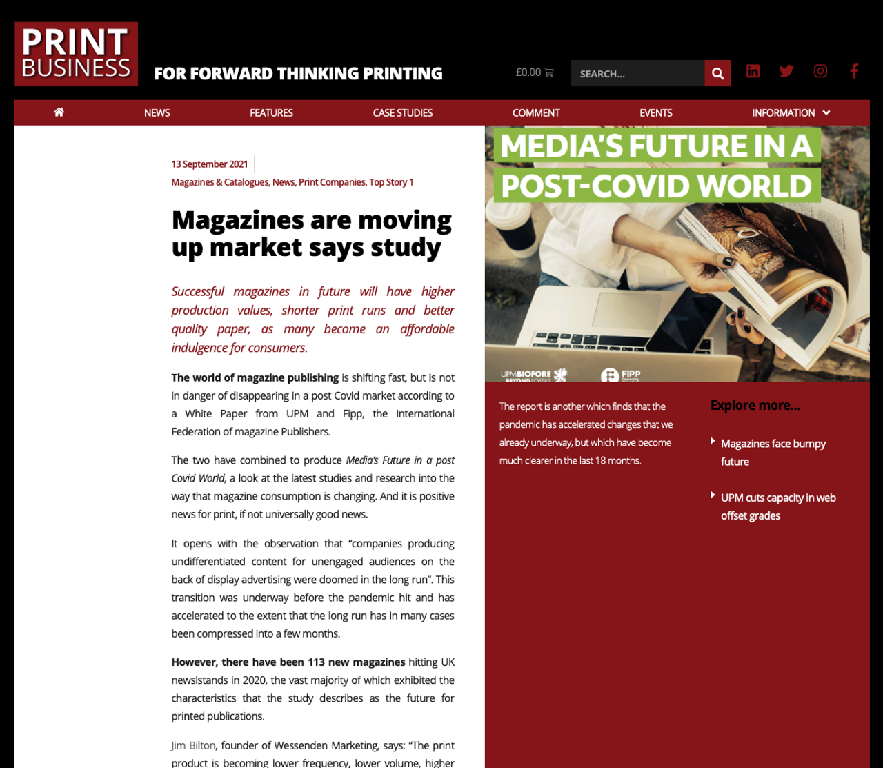 Business afdrukken , gebaseerd in het Verenigd Koninkrijk, heeft een interessant rapport uit een witboek 'Media's Future in a post Covid World' geproduceerd door UPM en Fipp, de International Federation of magazine Publishers, die suggereert dat consumenten bereid zijn om meer te betalen voor een betere kwaliteit tijdschriften, minder vaak gepubliceerd, maar met meer pagina's.