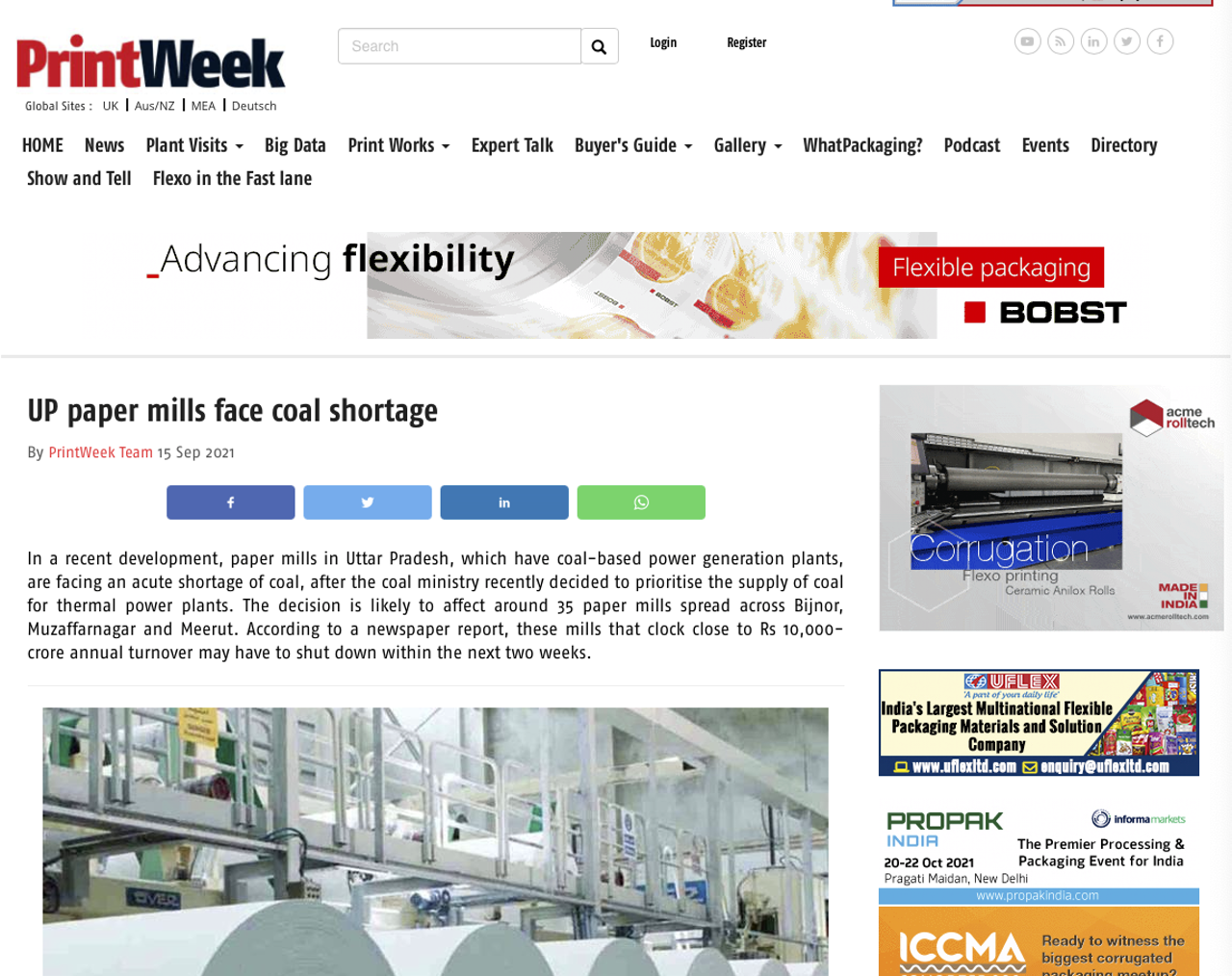 Printweek India heeft een verhaal uit Uttar Pradesh waar een tekort aan kolen is van invloed op ongeveer 35 lokale papierfabrieken die op kolen gebaseerde stroomopwekking hebben en die misschien binnen enkele weken moeten worden stilgelegd. Dit is het gevolg van het feit dat het ministerie van steenkool prioriteit geeft aan de levering van steenkool aan thermische centrales.