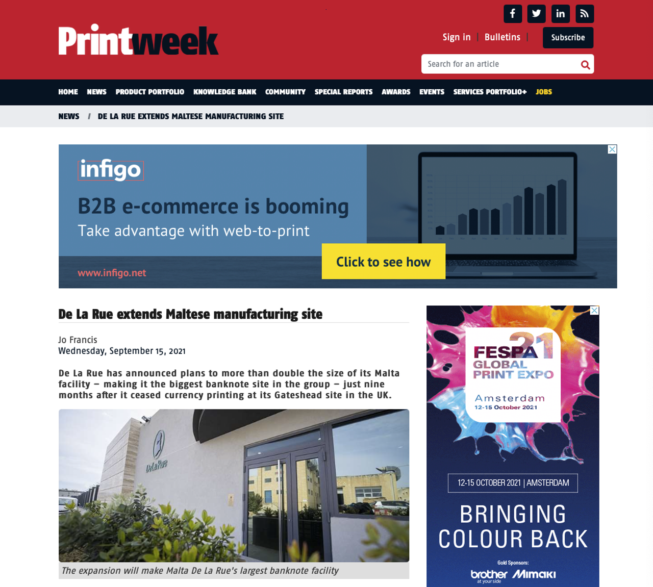 Volgens Printweek De Britse veiligheidsdruilgroep De La Rue is van plan om haar Maltese faciliteit te verdubbelen, waardoor ongeveer 100 nieuwe banen worden gecreëerd en het de grootste locatie binnen de groep wordt gemaakt voor het produceren van bankbiljetten. Dit komt slechts negen maanden nadat de onderneming op haar Gateshead-site in het Verenigd Koninkrijk de valutadruk heeft gestaakt.