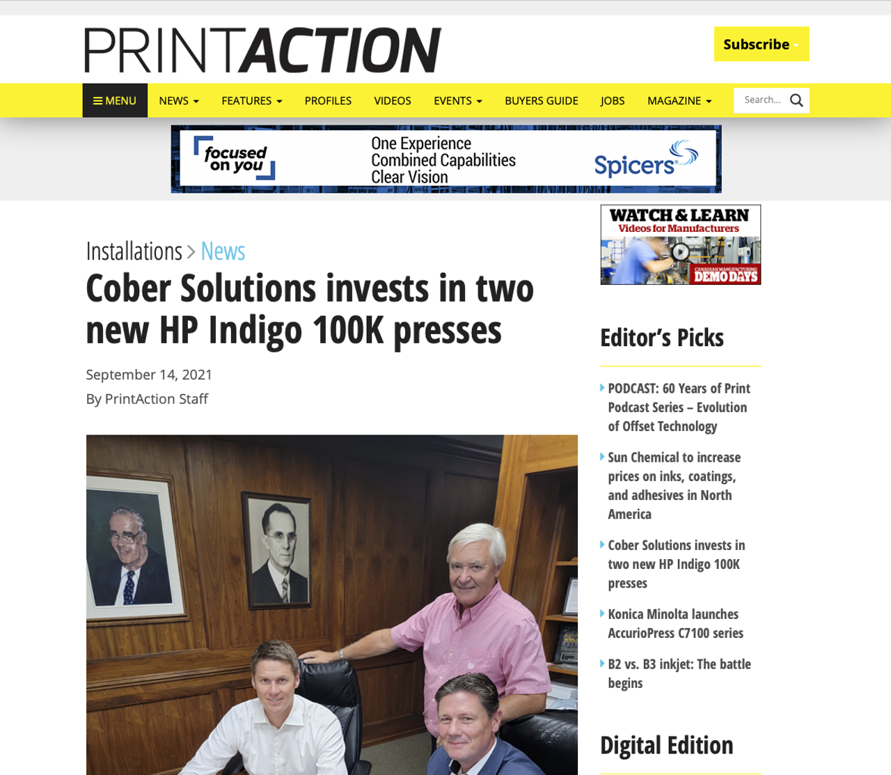 Nog steeds in Canada, Afdrukactie heeft ook een verhaal over Cober Solutions, een 100 jaar oude familie run print business gevestigd in Ontario, die is uit te breiden met twee HP Indigo 100K Digitale Presses en HP Site Flow voor data management en workflow automatisering om het te helpen met meer korte run werk.