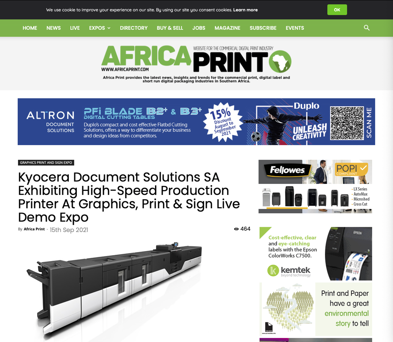 Afrika afdrukken schrijft dat Kyocera Document Solutions Zuid-Afrika zal pronken met zijn TASKalfa Pro 15000c high-speed productie inkjet kleurenprinter in oktober op het land's Graphics, Print and Sign Live Demo expo. Blijkbaar Zuid-Afrikaanse bedrijven zijn op zoek naar digitale print om de veiligheid te verbeteren en om te gaan met kortere runs.