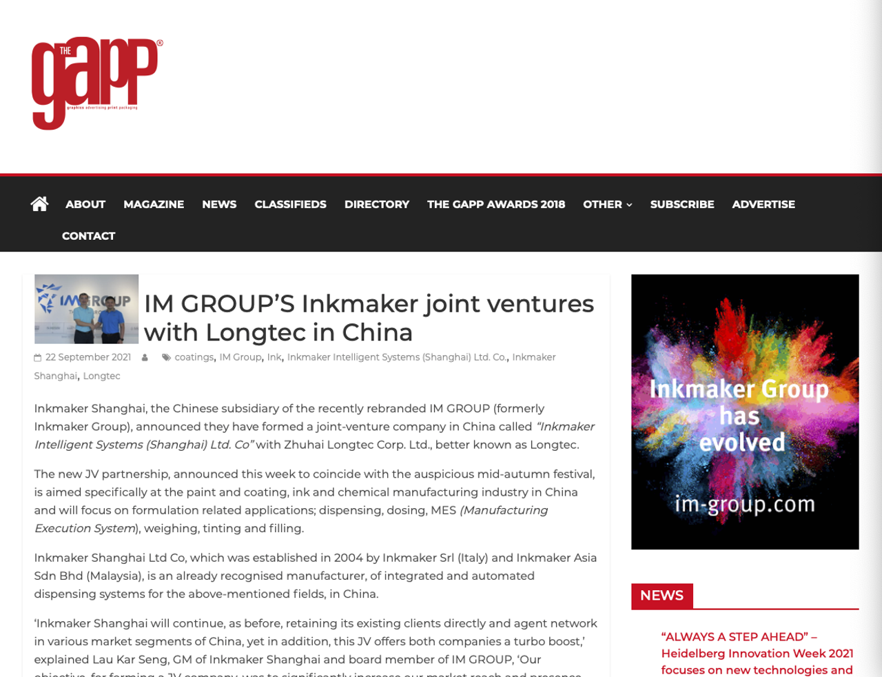 Het Gapp Magazine van Zuid-Afrika meldt dat Inkmaker Shanghai, de Chinese dochteronderneming van de IM-groep, samen met Zhuhai Longtec Corp Ltd, beter bekend als Longtec, een joint venture company in China, Inkmaker Intelligent Systems (Shanghai) Ltd, zou vormen. om hun marktaandeel in China te vergroten.