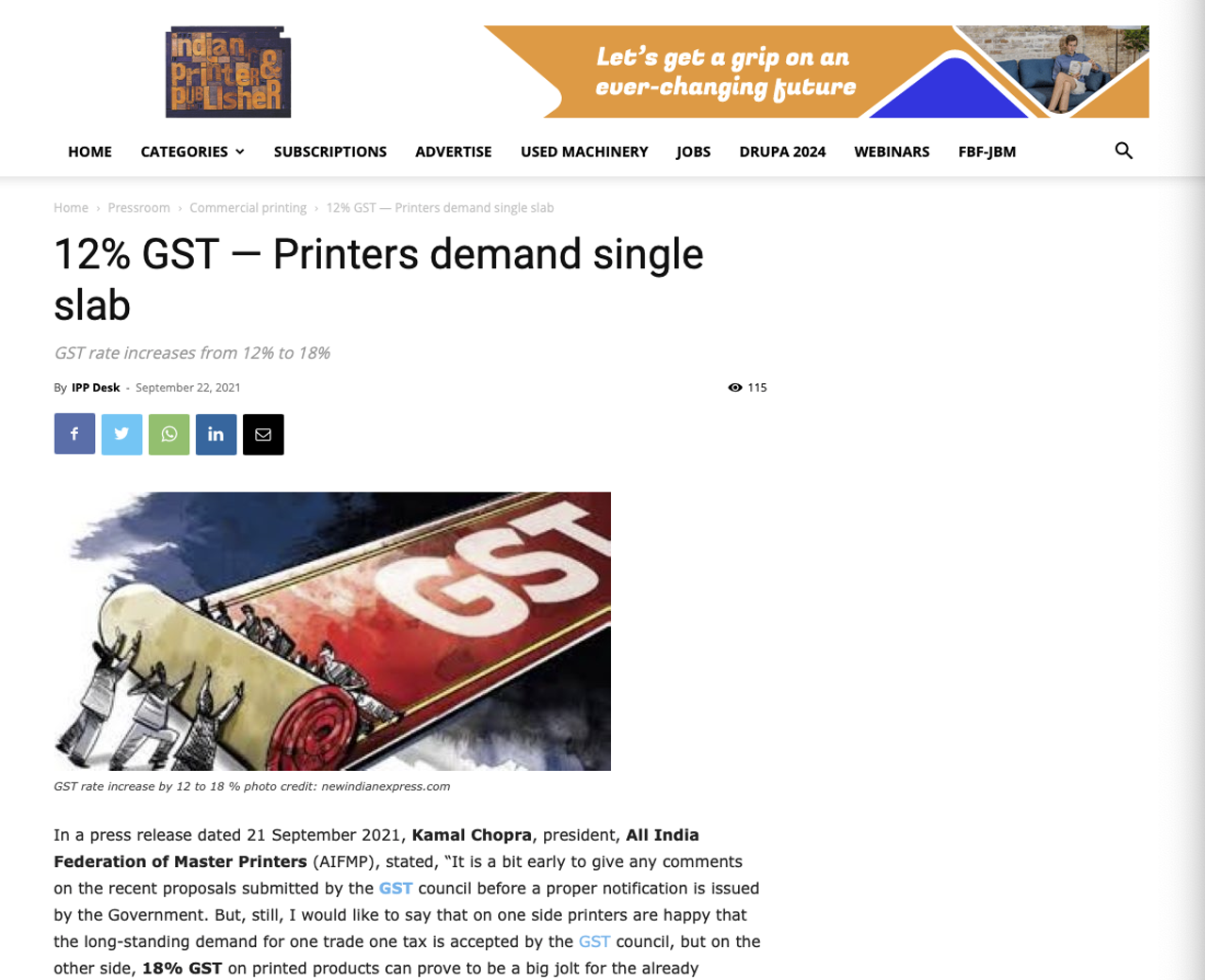 Ondertussen, Indian Printer en Publisher heeft voorstellen van de Raad voor de goederen-en dienstenbelastingen gedaan om de drie belastingniveaus te rationaliseren en een persbericht uit de All India Federation of Master Printers te citeren waarin wordt vermeld dat 18 procent te hoog is voor veel kleine printers, Vooral na de pandemie.