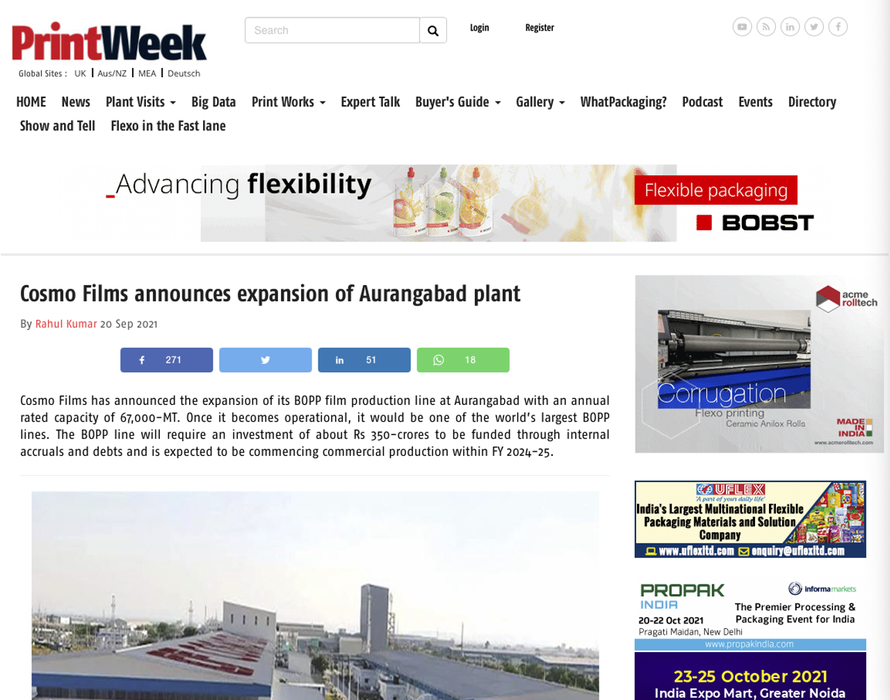 Printweek India heeft ook betrekking op Cosmo Films besluit om zijn BOPP film productie lijn uit te breiden in Aurangabad, die zal worden een van de grootste BOPP-lijnen van de wereld wanneer het begint de productie, verwacht te zijn in 2024-5. Dit is te wijten aan de groeiende vraag in India en zal worden gefinancierd door interne overlopende activa en schulden.