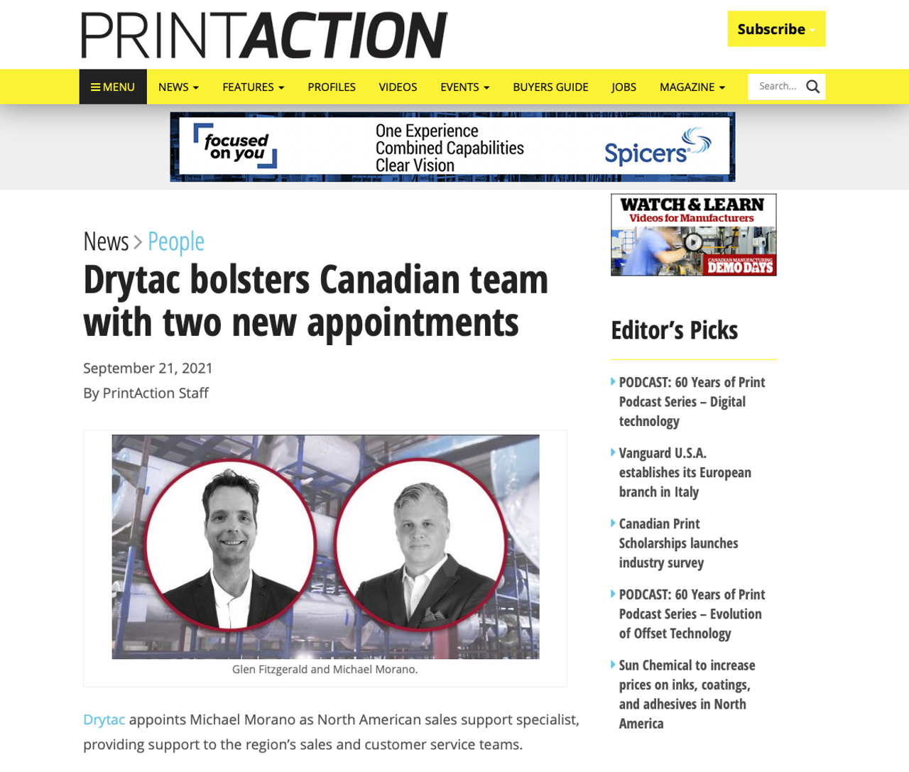 Uit Canada, Afdrukactie merkt op dat Drytac zijn Canadese team heeft uitgebreid met twee nieuwe afspraken. Zo heeft Michael Morano zich aangesloten als Noord-Amerikaanse sales support specialist, terwijl Glen Fitzgerald is de nieuwe technische sales manager voor industriële producten in rekening gebracht met het verhogen van Drytac's op maat en contract zelfklevende coating bedrijf in Noord-Amerika.