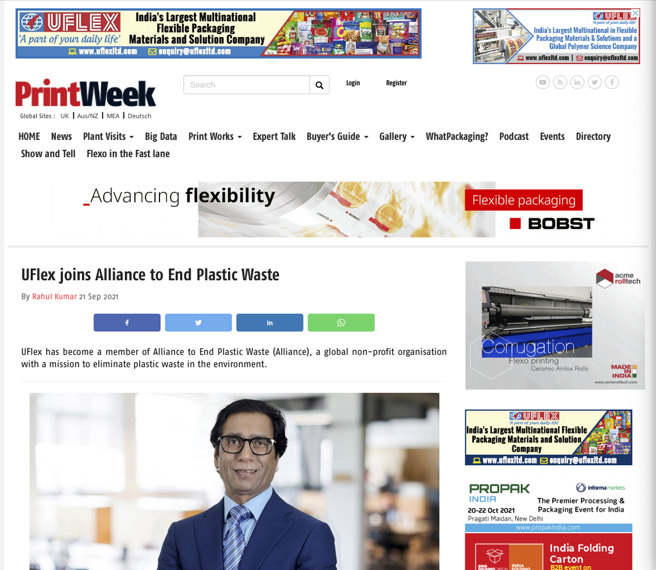 Printweek India schrijft dat UFlex, India's grootste flexibele verpakkingsbedrijf, lid wordt van de Alliantie om Plastic Afval te beëindigen, een wereldwijde non-profit organisatie die hoopt plastic afval uit het milieu te verwijderen. Het verhaal citeert Ashok Chaturvedi, hoofd van UFlex, die zegt: "Plastic afvalcrisis is een van de meest dringende mondiale zorgen van vandaag".